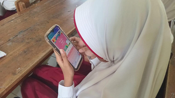 Lanjut ke layar yang menampilkan contoh video storytelling. Murid-murid memperhatikan video dengan seksama. Mereka tidak hanya akan berlatih berbicara di depan kamera, tetapi juga merekam dan mengedit video sendiri dengan ponsel yang mereka bawa dari rumah.