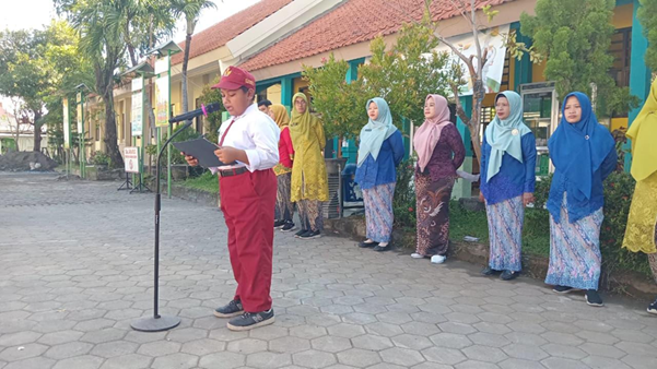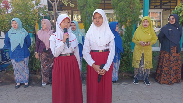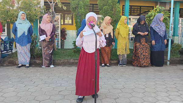 Nafeeza Aqila Chandra (Kelas 1) membacakan puisi yang berisikan pujian, harapan, dan haturan selamat hari jadi untuk Sidoarjo. “Kota Bandeng dan Udang, lambang kemakmuran. Terus melaju, baik bermartabat dalam pembangunan,” tuturnya.